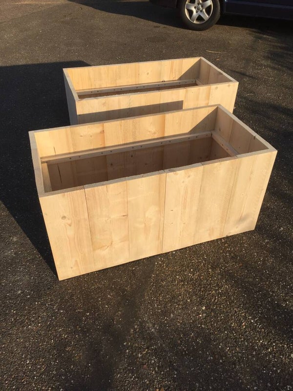 Voor buiten zullen ze behandeld moeten worden, om ze weerbestendig te maken. Met bijvoorbeeld white of greywash. De bakken staan op een kunststof nagel. Zodat ze net van de grond af staan, in verband met vocht.