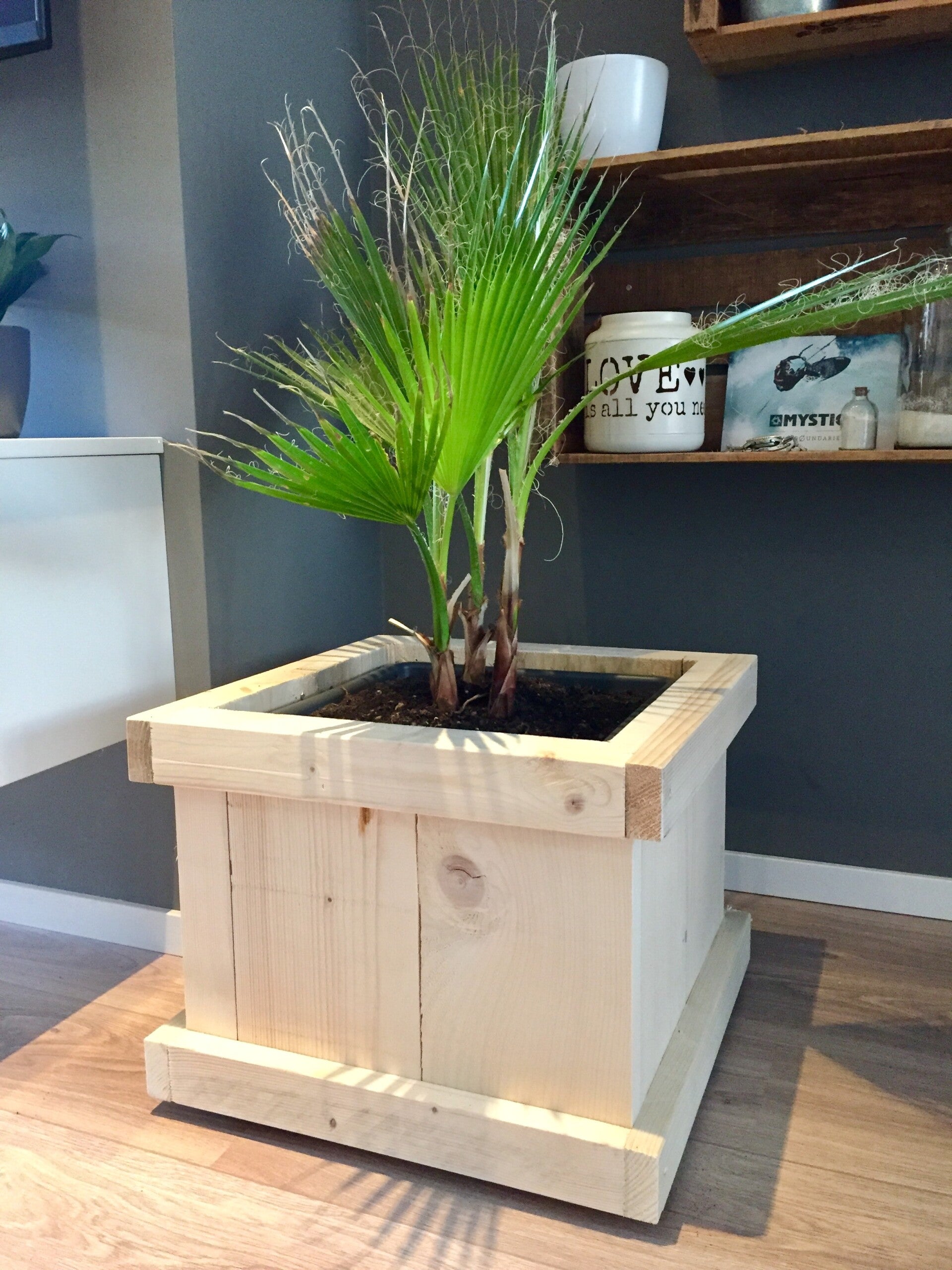 Voor buiten zullen ze behandeld moeten worden, om ze weerbestendig te maken. Met bijvoorbeeld white of greywash. De bakken staan op een kunststof nagel. Zodat ze net van de grond af staan, in verband met vocht.
