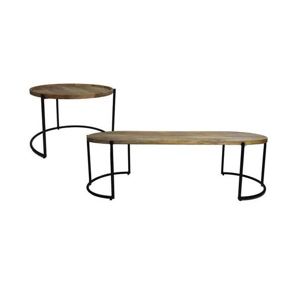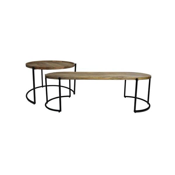 Deze salontafelset is gemaakt van zwart metaal en heeft een mangohouten blad. De set bestaat uit een ronde en een ovale salontafel. Het elegante onderstel geeft de tafels een chique uitstraling. Deze tafels zijn makkelijk onder elkaar te schuiven en geven je huis een speelse uitstraling. De ronde tafel heeft een diameter van 70 cm en is 45 cm hoog, de ovale salontafel is 140 cm lang, 55 cm breed en 40 cm hoog. Door de combinatie van het lichte mangohout met het zwart metalen onderstel passen deze tafels perfect in een industriële of landelijke woonstijl.